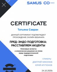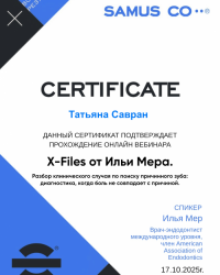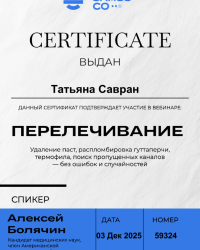 - Сертификат «Ключевые аспекты и клинические решения на этапе пред-эндодонтической подготовки», 2025 г.