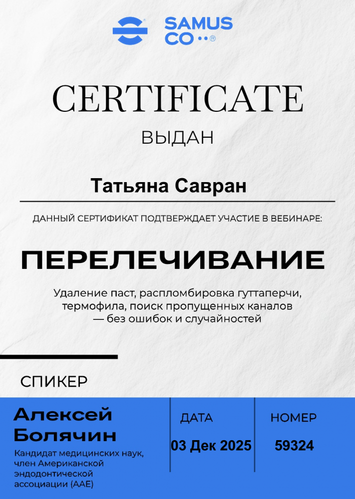 - Сертификат «Ключевые аспекты и клинические решения на этапе пред-эндодонтической подготовки», 2025 г.